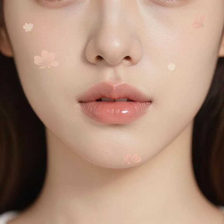 Femboy lips, minimalist makeup look with a slight shimmer, tender and youthful appearance, soft lighting with warm undertones, ultra-realistic style, shallow depth of field, surrounded by subtle floral motifs, invoking a gentle and serene mood