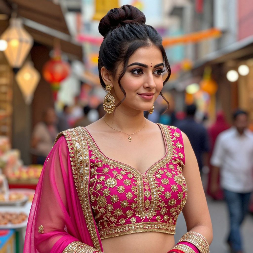 A vibrant and detailed photo of a young woman with a bold bun gajra hairstyle, wearing a traditional Indian festival costume with bright pink and gold embroidery, her face slightly turned to the side with soft smile, standing in a colorful marketplace during Diwali with lanterns and festive decorations in the background.. The woman has big breasts and cute face