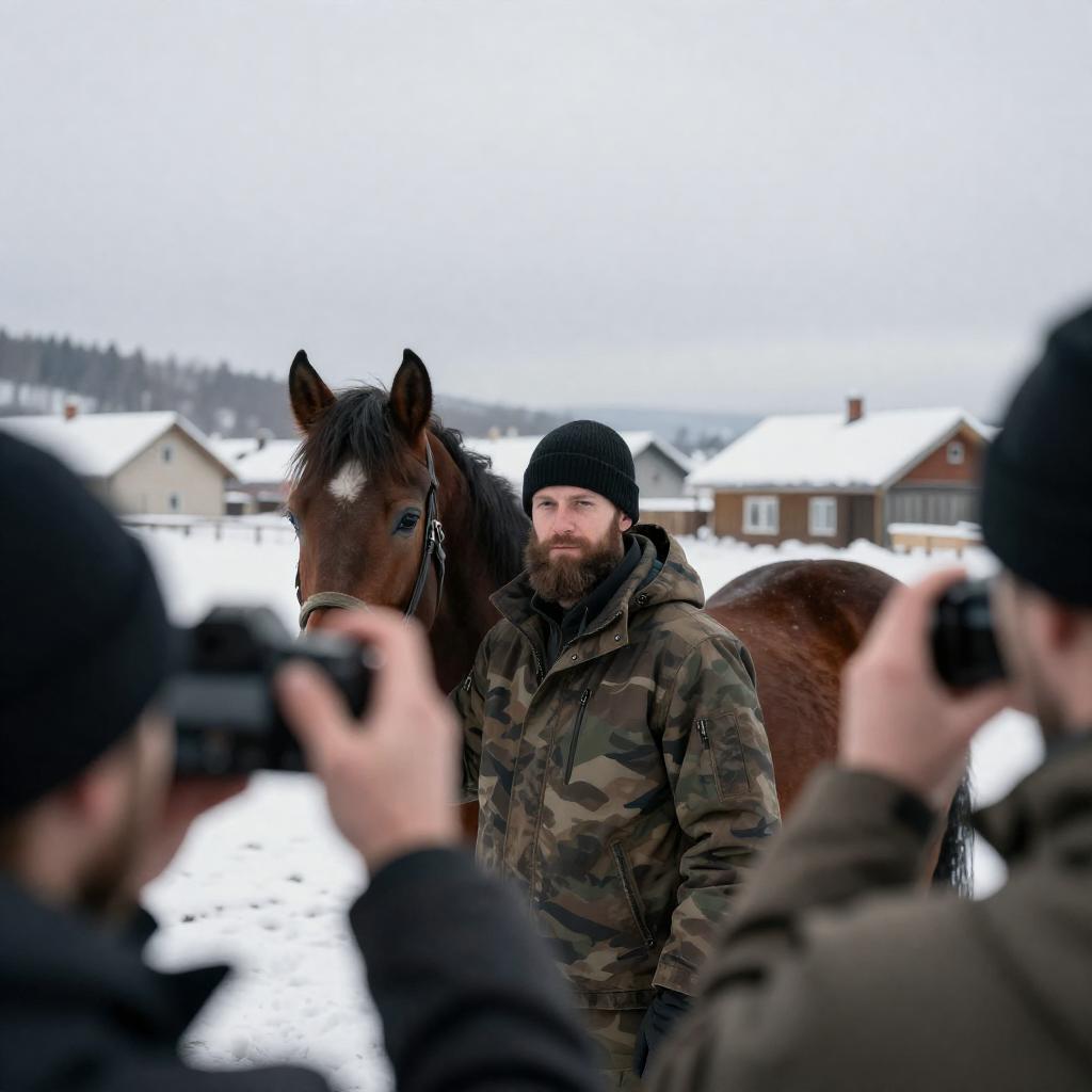 Photograph of a bearded man in a camouflage jacket and black beanie standing beside a dark brown horse in a snowy village. A person in the foreground takes a photo with a camera. Snow-covered buildings and a cloudy sky in the background. The man has a serious expression. The person taking the photo is partially visible, with only their back and hand holding the camera.