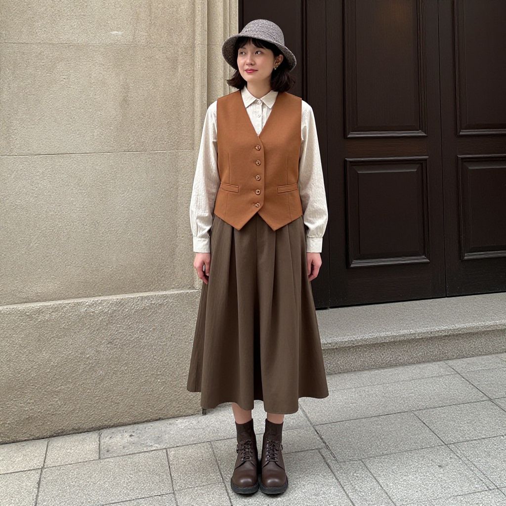 Photograph of an Asian woman standing outdoors against a beige stone wall and large black door. She has medium-length black hair, wears a gray felt hat, a white long-sleeve shirt, brown leather vest with buttons, and a brown high-waisted, ankle-length skirt. Her black lace-up boots have a chunky heel. She has a fair complexion and a calm expression. The ground is paved with light gray tiles. The lighting is natural, suggesting daytime. The overall style is vintage or retro, with a simple, classic aesthetic.