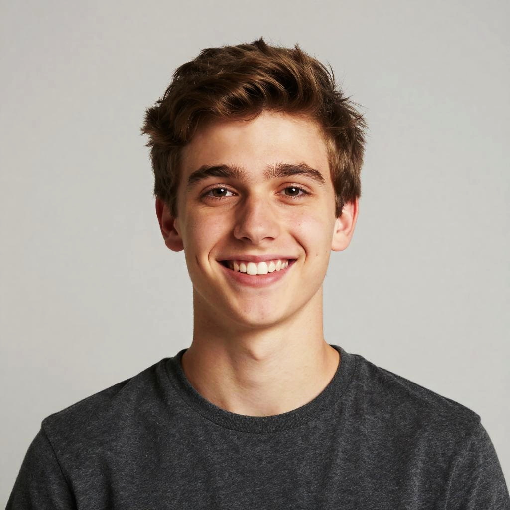 Photograph of a young man with light skin and brown, slightly messy hair. He has a friendly smile, showcasing straight white teeth, and dark brown eyes. He is wearing a simple, dark gray, crew-neck shirt. The background is a plain, light gray, which highlights his face and smile. The lighting is even, eliminating any harsh shadows. His overall appearance is casual and approachable, with a natural, relaxed demeanor. The image has a clean, portrait-style composition with a focus on the subject's upper body.