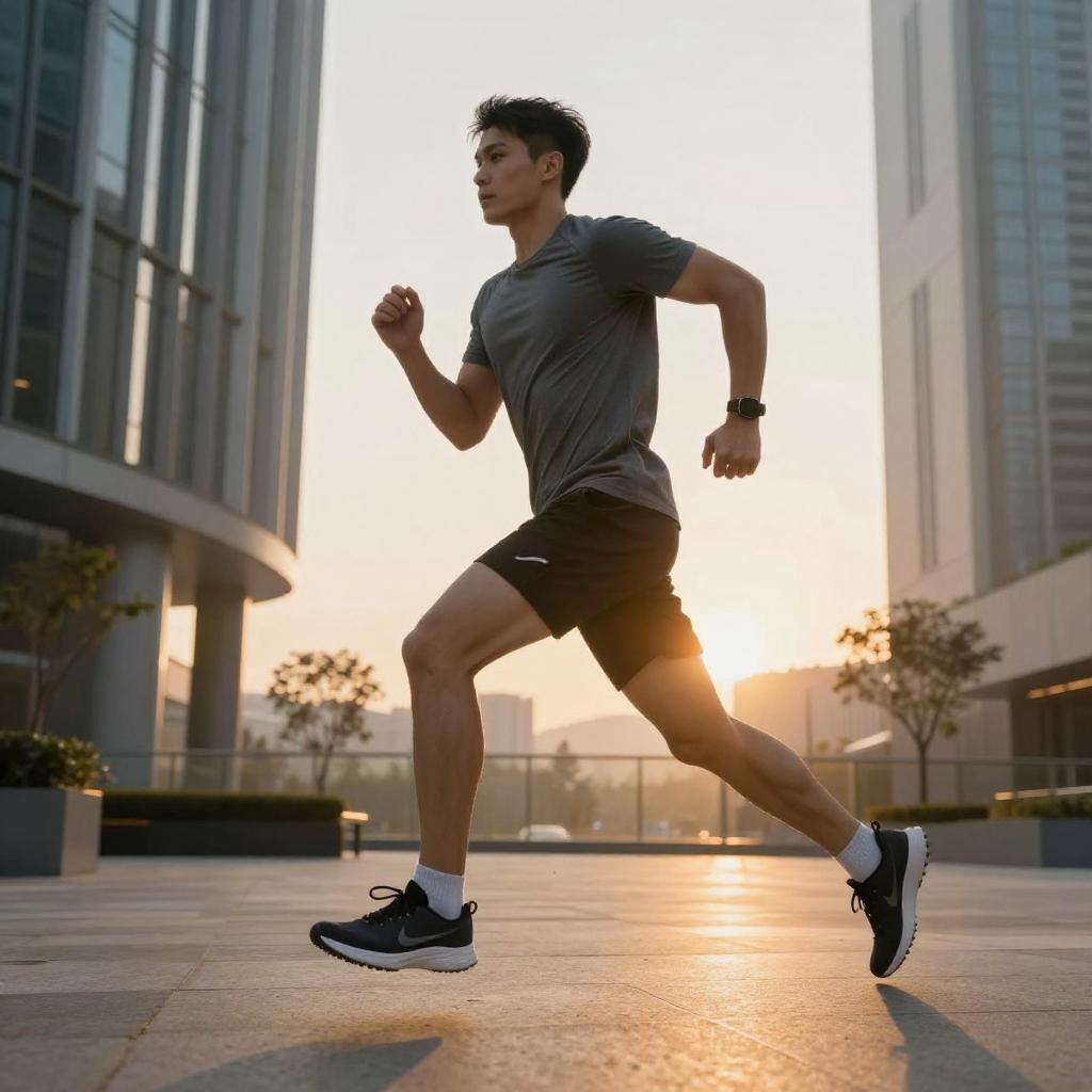 A man is captured in a dynamic running pose, showcasing athleticism and determination against a modern urban backdrop at sunrise. The warm hues of the sunrise cast a golden glow, highlighting the sleek lines of contemporary architecture around him. His sporty attire emphasizes a commitment to fitness and outdoor activity.