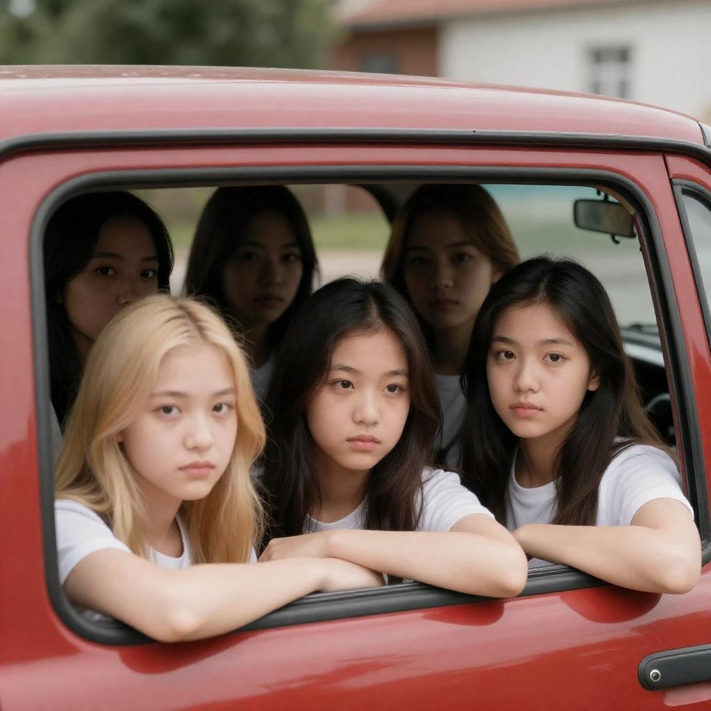 Photograph of six young women with varying hair colors and styles, sitting in a red car. They are looking out the windows with serious expressions. The car is parked outdoors with a blurred green and white background. The women are closely packed, with the blonde woman in the front left and the brunette in the back right.