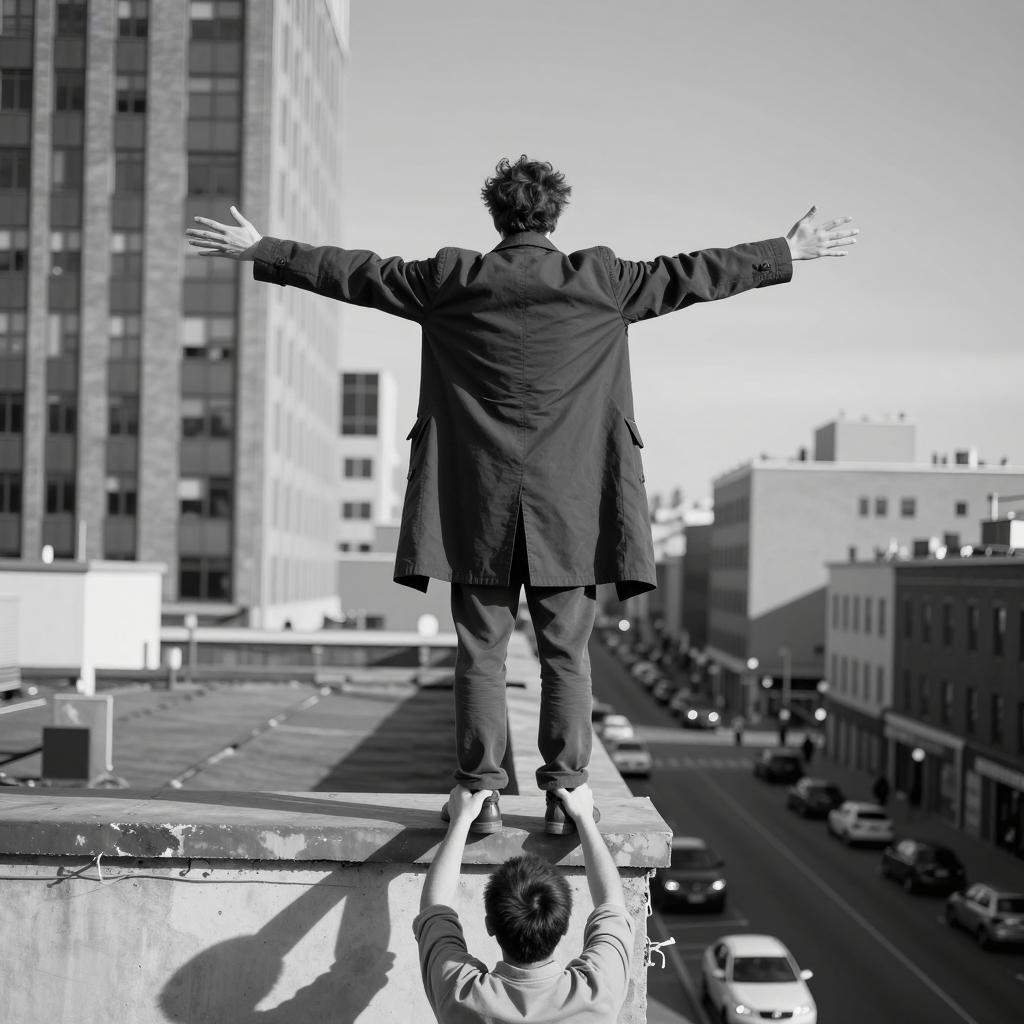 Man leaning on a brick wall, standing in a window frame. Wearing light-colored shirt, dark pants, white socks, black shoes. Arms outstretched, right leg bent, foot on windowsill. Dark brick wall, yellow-lit window background. Nighttime, dim lighting.
