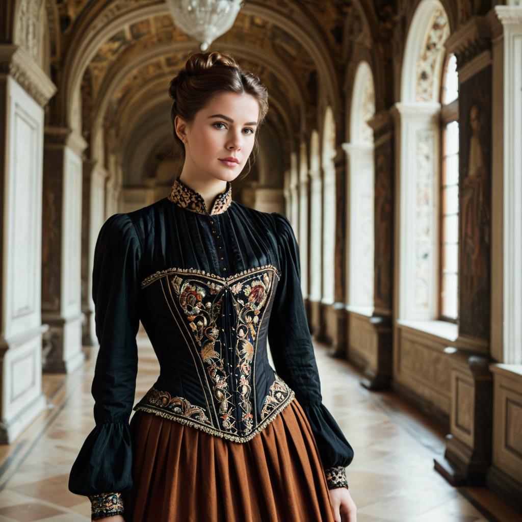 Really pretty long dress, photorealistic portrait of young woman, standing in ornate building hallway, wearing black long-sleeve blouse, brown embroidered corset, and brown pleated skirt, brown hair in loose updo, serious expression, natural light, Renaissance style clothing, soft focus background, elegant, historic architecture, detailed embroidery, realistic ures, fashionable, vintage, historical fashion, digital art, Renaissance revival style