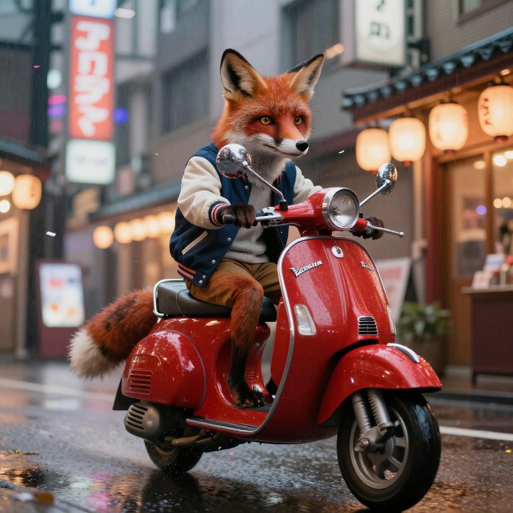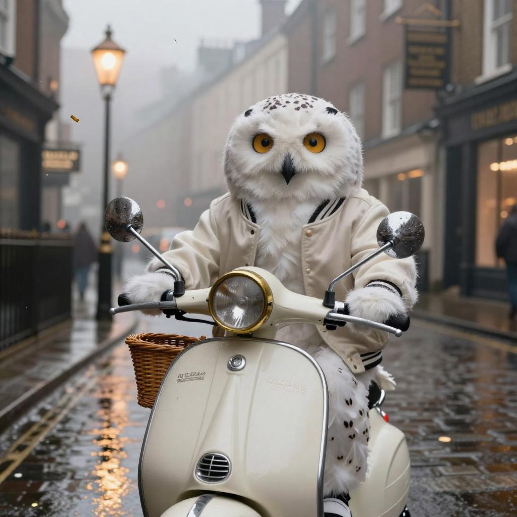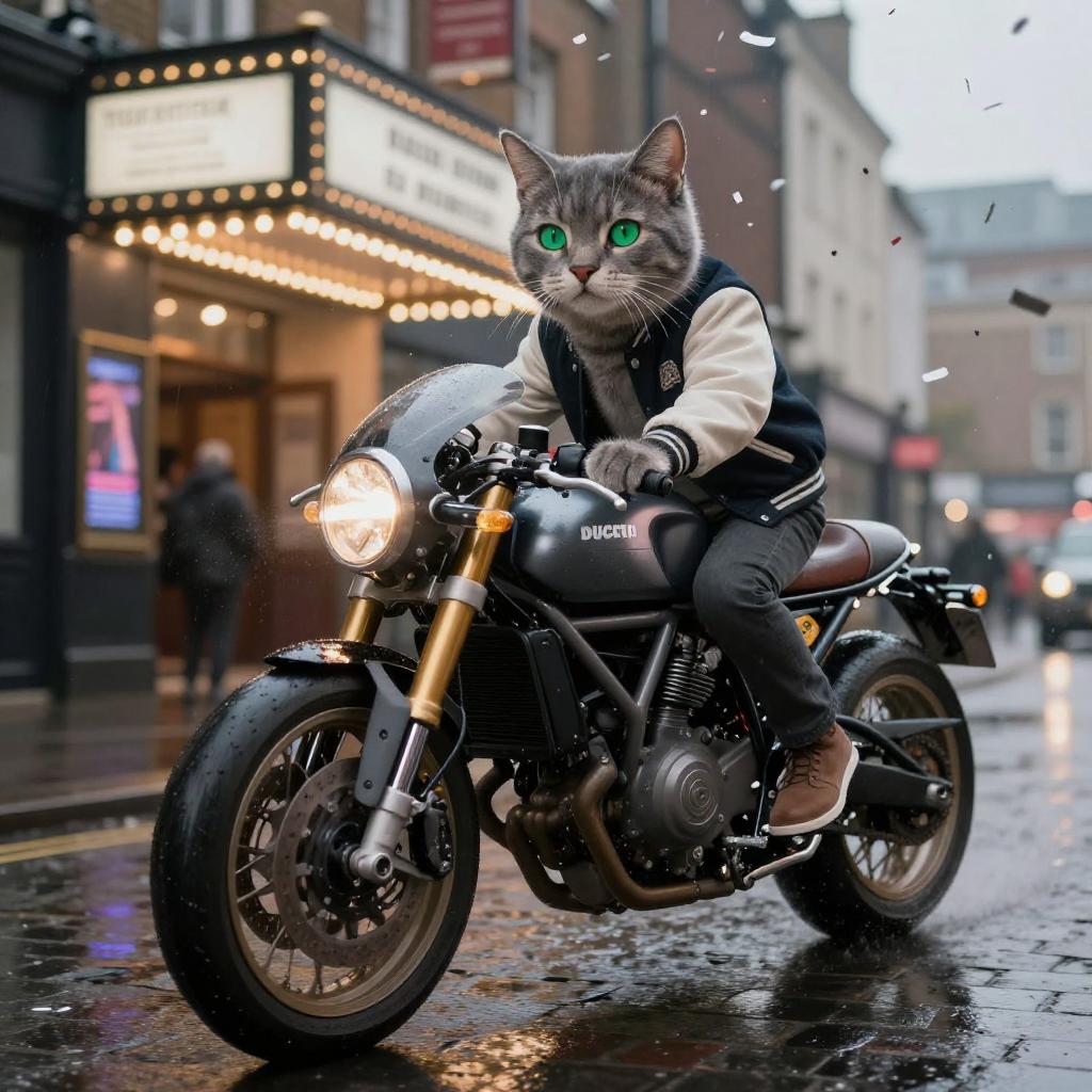 Realistic editorial photo of anthropomorphic snow leopard street-fashion model with high-detail spotted fur, sharp whiskers and piercing ice-blue eyes riding matte-black retro cafe racer motorcycle with copper accents, round vintage headlamp and worn-leather seat through rain-slick Parisian boulevard at night with glimmering cobblestones, warm bistro string lights, passing vintage tram and puddles reflecting lamplight, wearing a stylish varsity jacket, candid street-fashion vibe, shallow depth of field, buttery bokeh, dynamic low angle, motion blur from spinning lights, glossy reflections in puddles, confetti drifting, high-detail fur and sharp whiskers, cinematic color grading, soft rim light, volumetric haze, HDR, noise-free, vibrant palette, lifelike eyes, natural color rendering, balanced composition