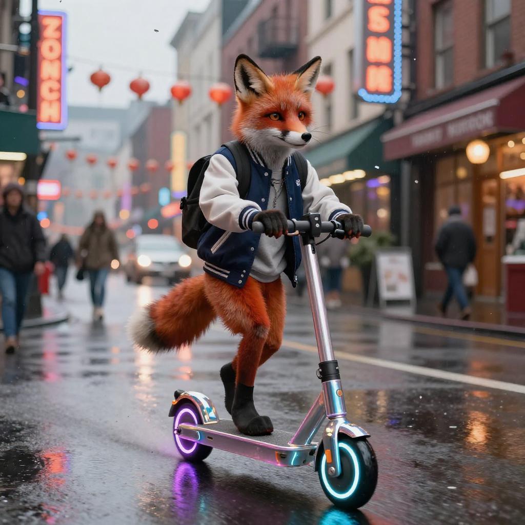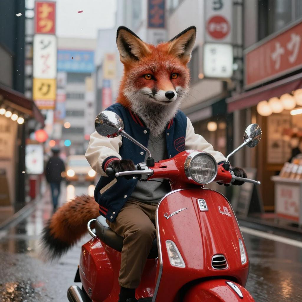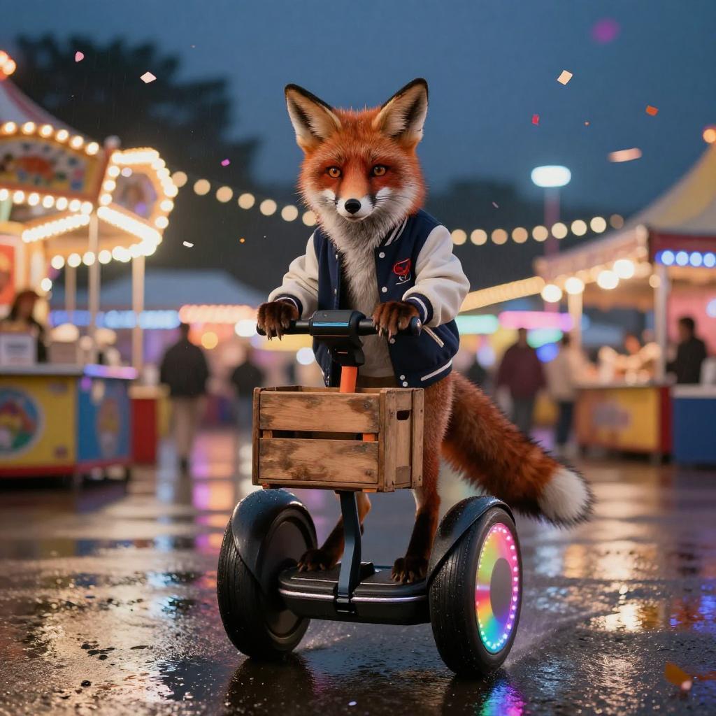 Realistic editorial photo of anthropomorphic snow leopard street-fashion model with high-detail spotted fur, sharp whiskers and piercing ice-blue eyes riding matte-black retro cafe racer motorcycle with copper accents, round vintage headlamp and worn-leather seat through rain-slick Parisian boulevard at night with glimmering cobblestones, warm bistro string lights, passing vintage tram and puddles reflecting lamplight, wearing a stylish varsity jacket, candid street-fashion vibe, shallow depth of field, buttery bokeh, dynamic low angle, motion blur from spinning lights, glossy reflections in puddles, confetti drifting, high-detail fur and sharp whiskers, cinematic color grading, soft rim light, volumetric haze, HDR, noise-free, vibrant palette, lifelike eyes, natural color rendering, balanced composition