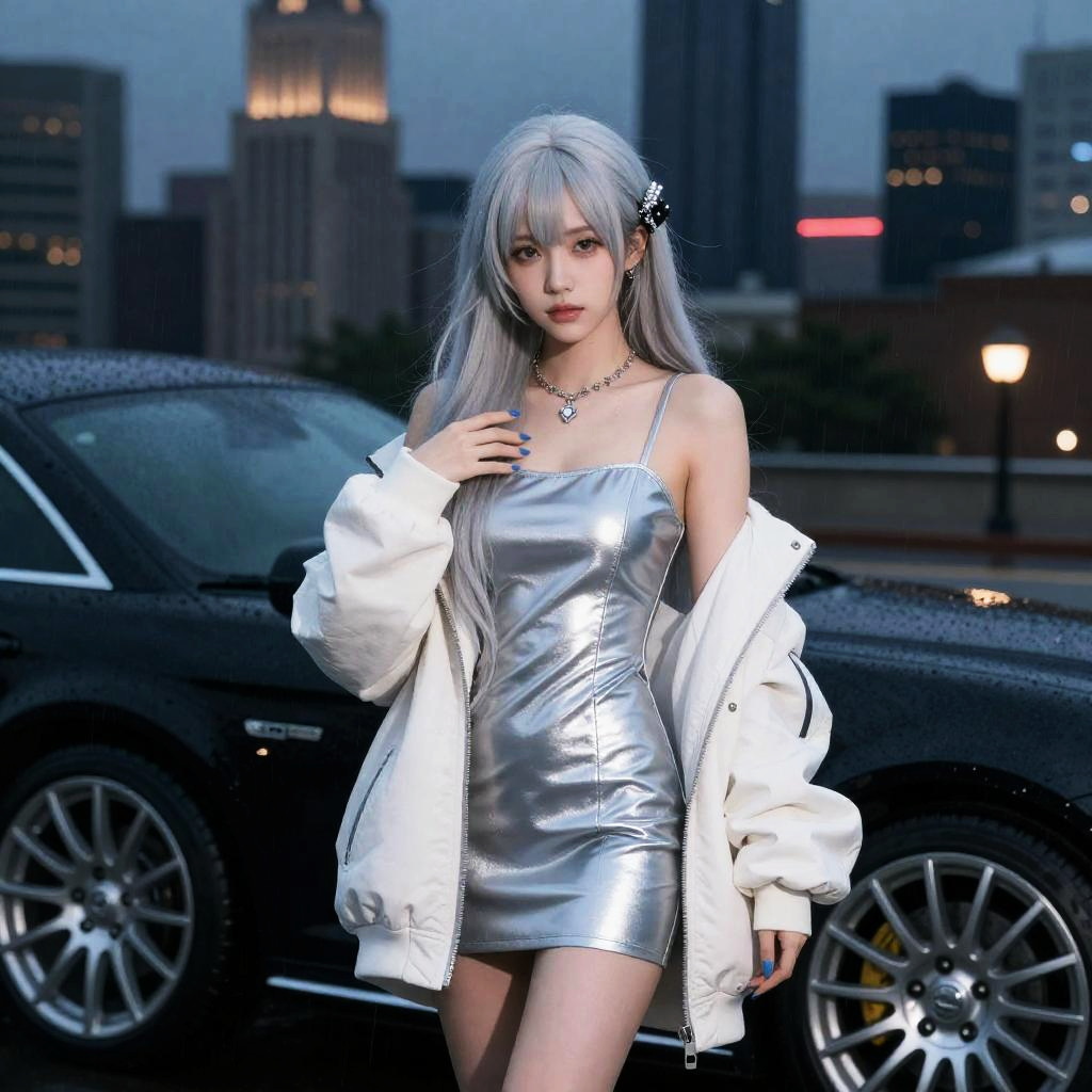 (8k, RAW photo, best quality, masterpiece:1.2), (realistic, photo-realistic:1.37), (wearing oversized_jacket:1.3), st. louis \(luxurious wheels\) \(azur lane\), 1girl, (Kpop idol), (aegyo sal:1), hair ornament, portrait, (long loose silver revealing dress:1.1), necklace, blue nails, cute, cityscape, night, rain, wet, professional lighting, photon mapping, radiosity, physically-based rendering