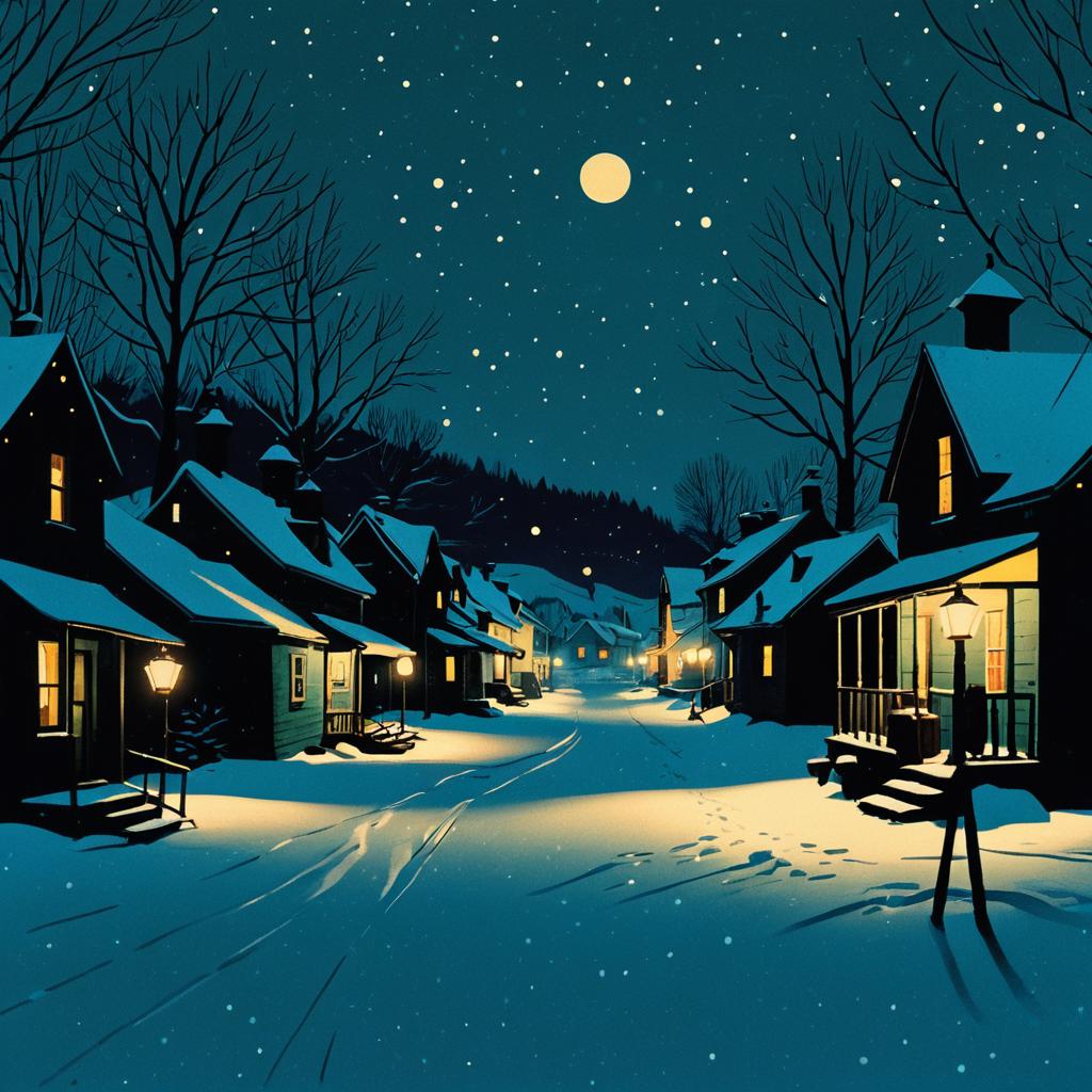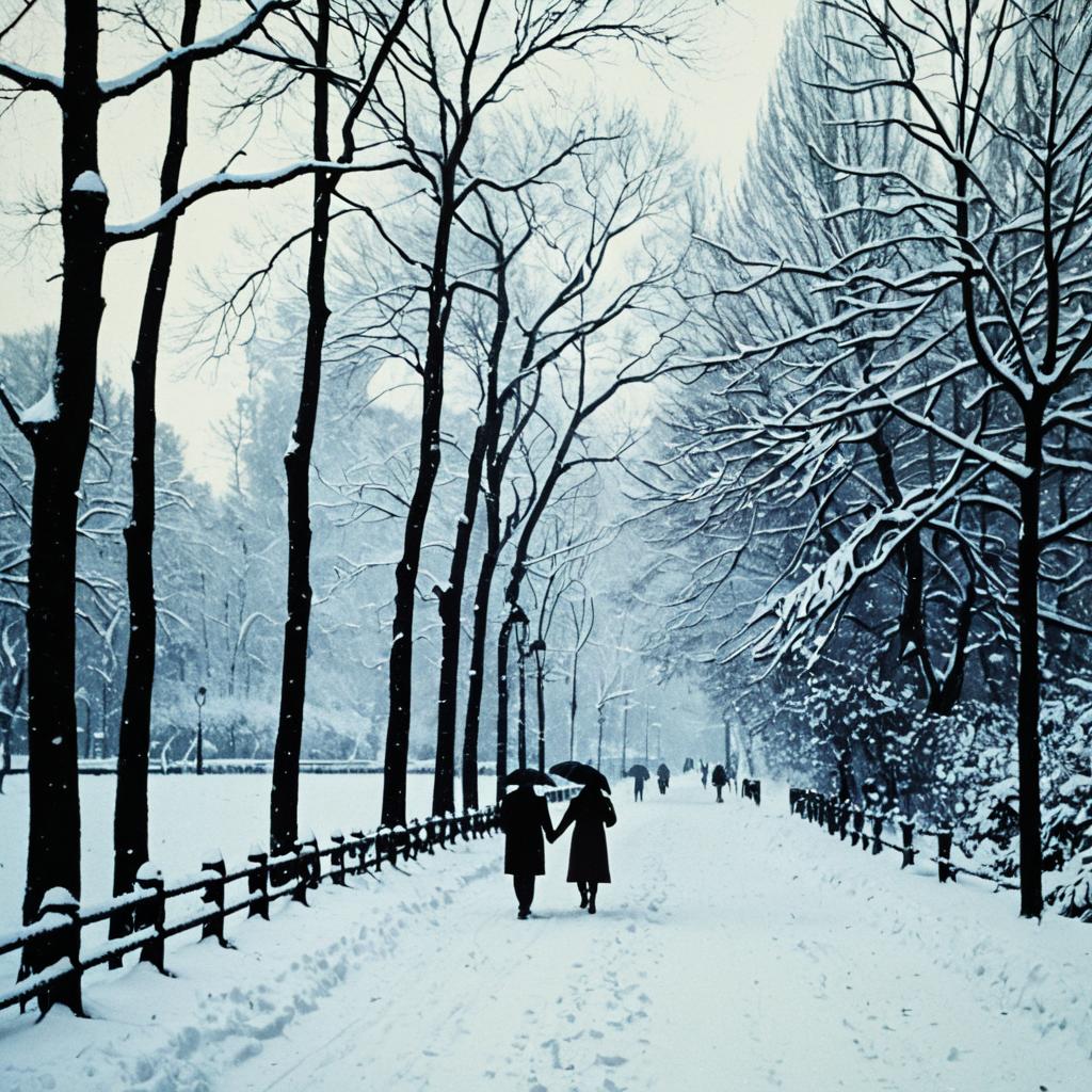 Animating Pipeline romantic winter stroll, in the style of Claude Monet, snow-laden trees, vintage color palette, black silhouettes.