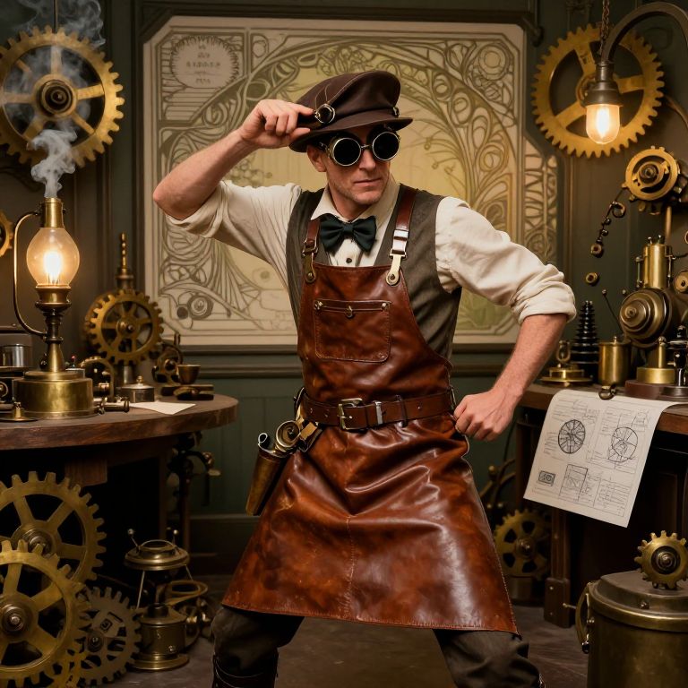 Steampunk inventor in brown leather apron, black hat, round goggles, white shirt, black bowtie, adjusting hat in gear-filled workshop.