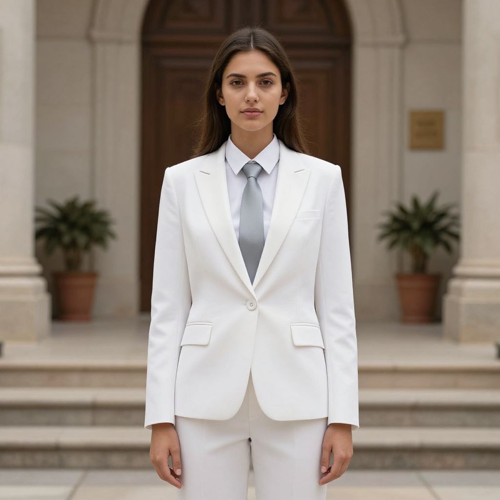 White blazer outfit woman, solo, 1girl, suit, formal, pants, necktie, realistic, looking at viewer, standing, white suit, jacket, church