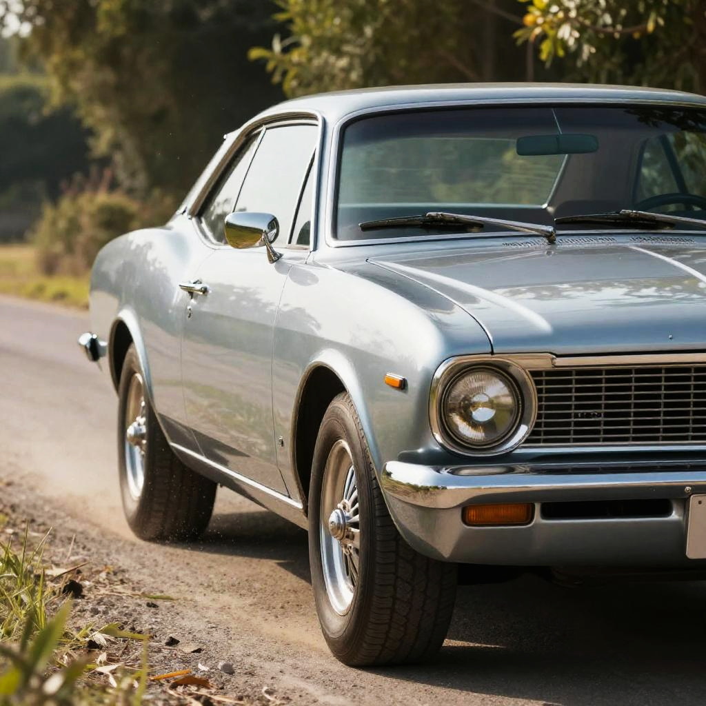 Stable diffusion prompts for photorealism, a sleek vintage car parked on a countryside road, crisp reflections on polished metal, sunlight filtering through trees, realistic dust particles in air, detailed tire treads and chrome textures, vivid natural background