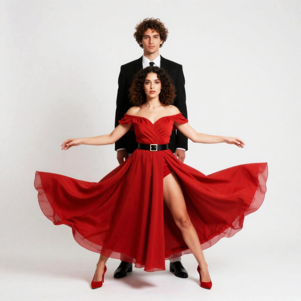 Photograph of a woman with curly brown hair, wearing a red off-shoulder dress and red heels, striking a confident pose with one leg raised. A man with curly hair and an astonished expression peeks from behind a blue surface on the left. White background. Woman's dress flutters. Red shoes match dress.