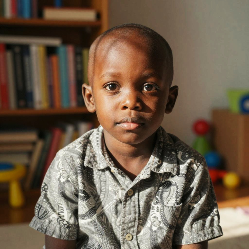 Portrait of a bald black kid with expressive bright eyes, wearing a patterned shirt, sitting quietly in a cozy room filled with warm sunlight, soft shadows and a background of bookshelves and playful toys, capturing innocence and curiosity.
