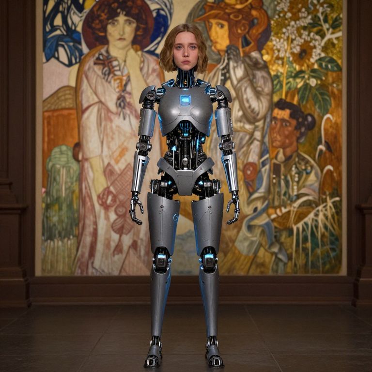 Photorealistic CGI of a female humanoid robot with silver metallic joints and blue glowing chest panel, standing in front of an Art Nouveau painting with intricate