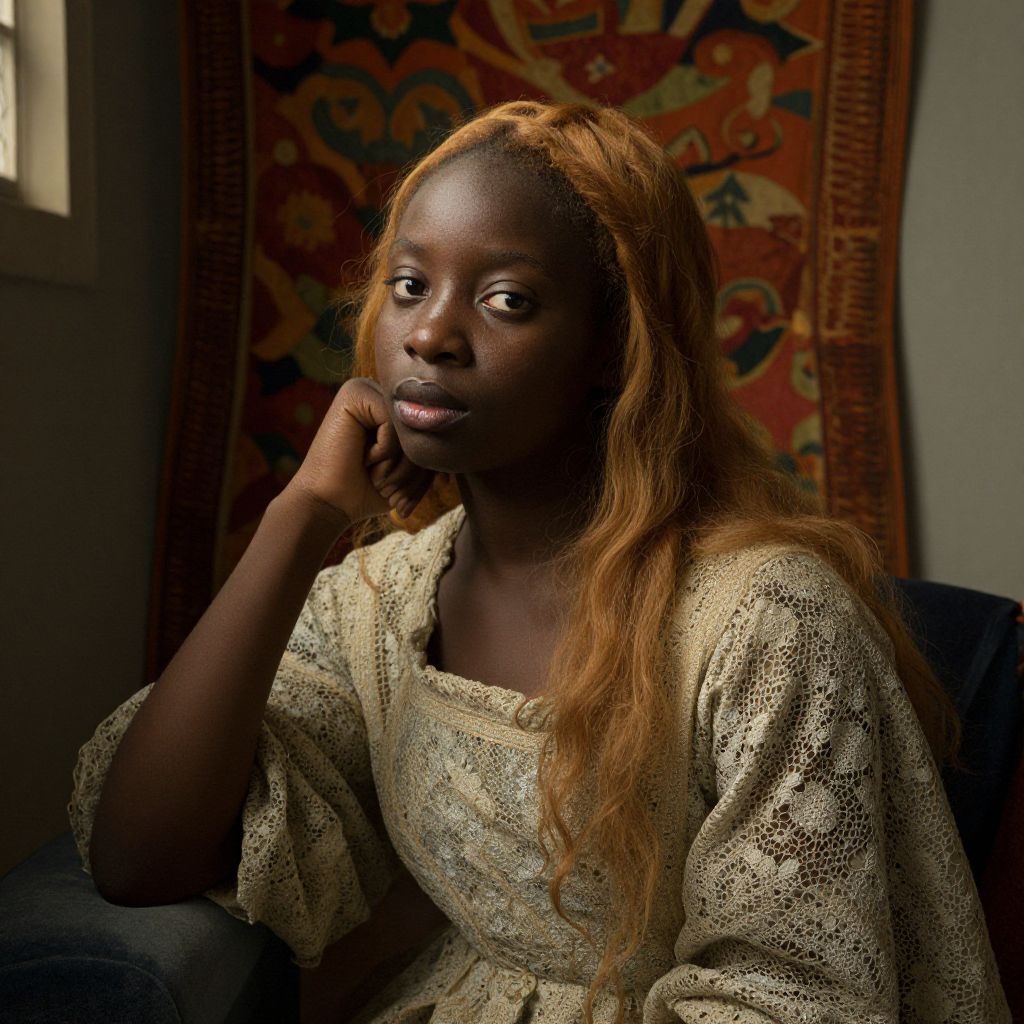 Create a striking iPhone portrait photo in the style of Dutch Golden Age paintings, depicting a Sub-Saharan African woman with an enigmatic expression. The woman sits gracefully in a softly lit room, her serene face and piercing gaze drawing you in. The rich tapestry backdrop and warm hues complement her intricate lace dress, while her porcelain skin and long, golden-brown hair cascading over her shoulders are accentuated by the delicate play of light. This intimate portrait captures a range of emotions, from tranquil contemplation to a hint of mystery, inviting viewers into a quiet, introspective connection.