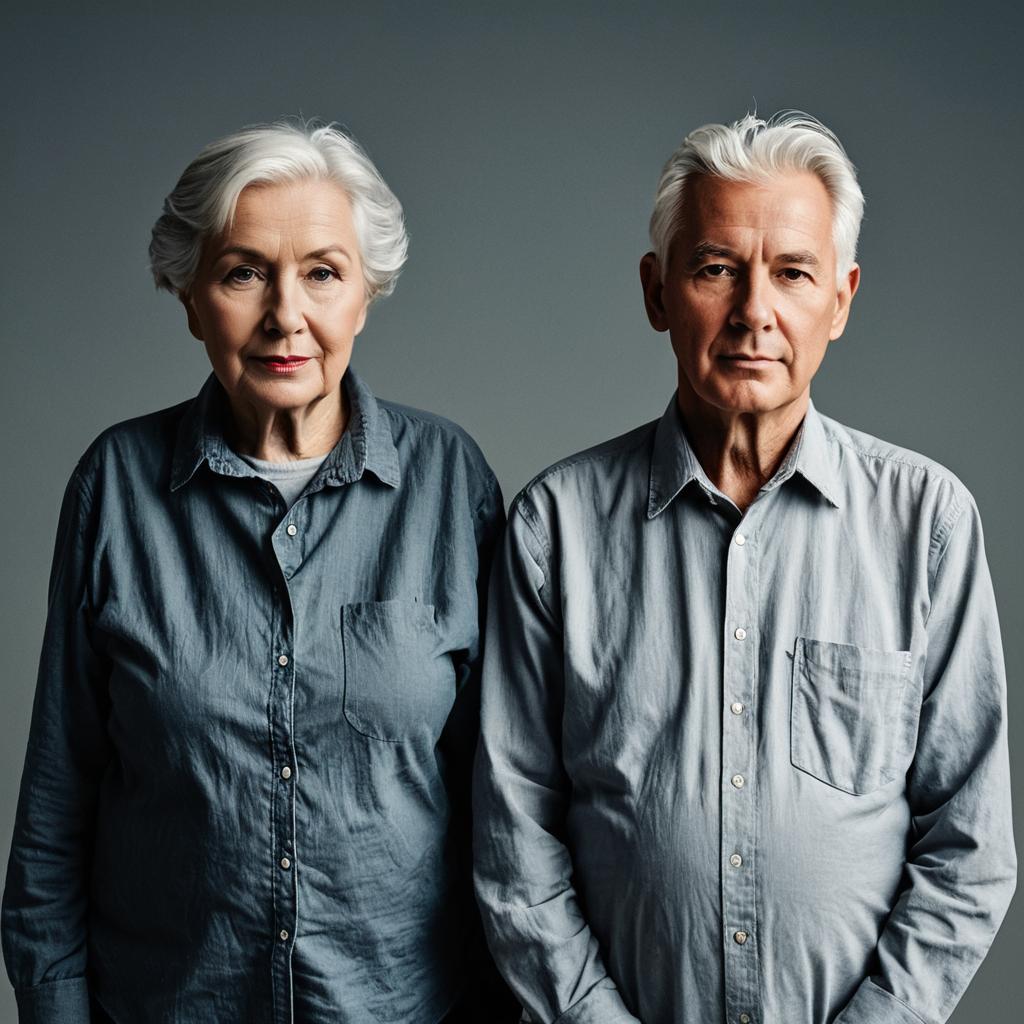 Man old lady,1boy, solo, male focus, old, old man, white hair, wrinkled skin, grey background, pocket, looking at viewer, long sleeves, shirt, realistic, standing, collared shirt, closed mouth, arms at sides, gradient background