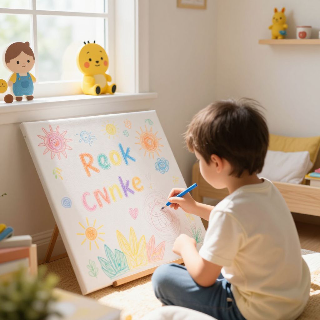 AI photo prompt for kids: A cozy bedroom corner with a child drawing on a large canvas using colorful AI-generated doodles, sunlight streaming through the window, cartoon characters in the background, friendly and bright, detailed but simple design, ideal for children's learning and creativity.