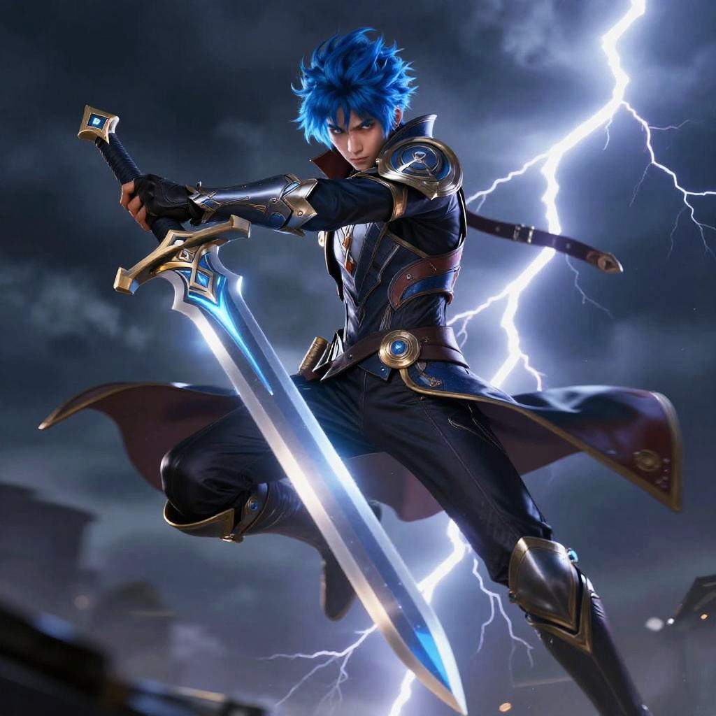 Action scene of blue hair boy wielding a glowing sword, mid-leap against a backdrop of a stormy sky with lightning, intense expression, dynamic motion blur, detailed armor with futuristic elements, dramatic lighting, high contrast colors, heroic fantasy setting.