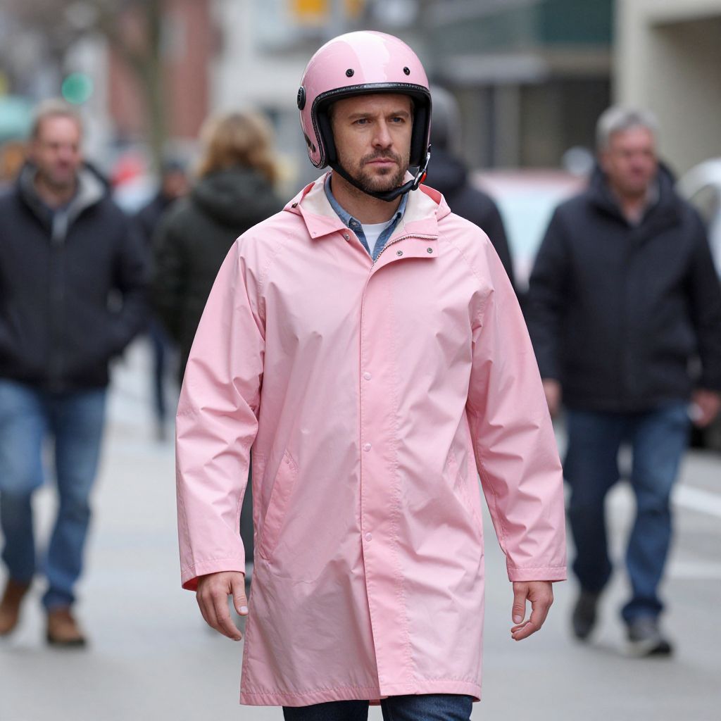 Photograph of a bearded man in a pink raincoat and matching helmet walking on a city street with blurred pedestrians.