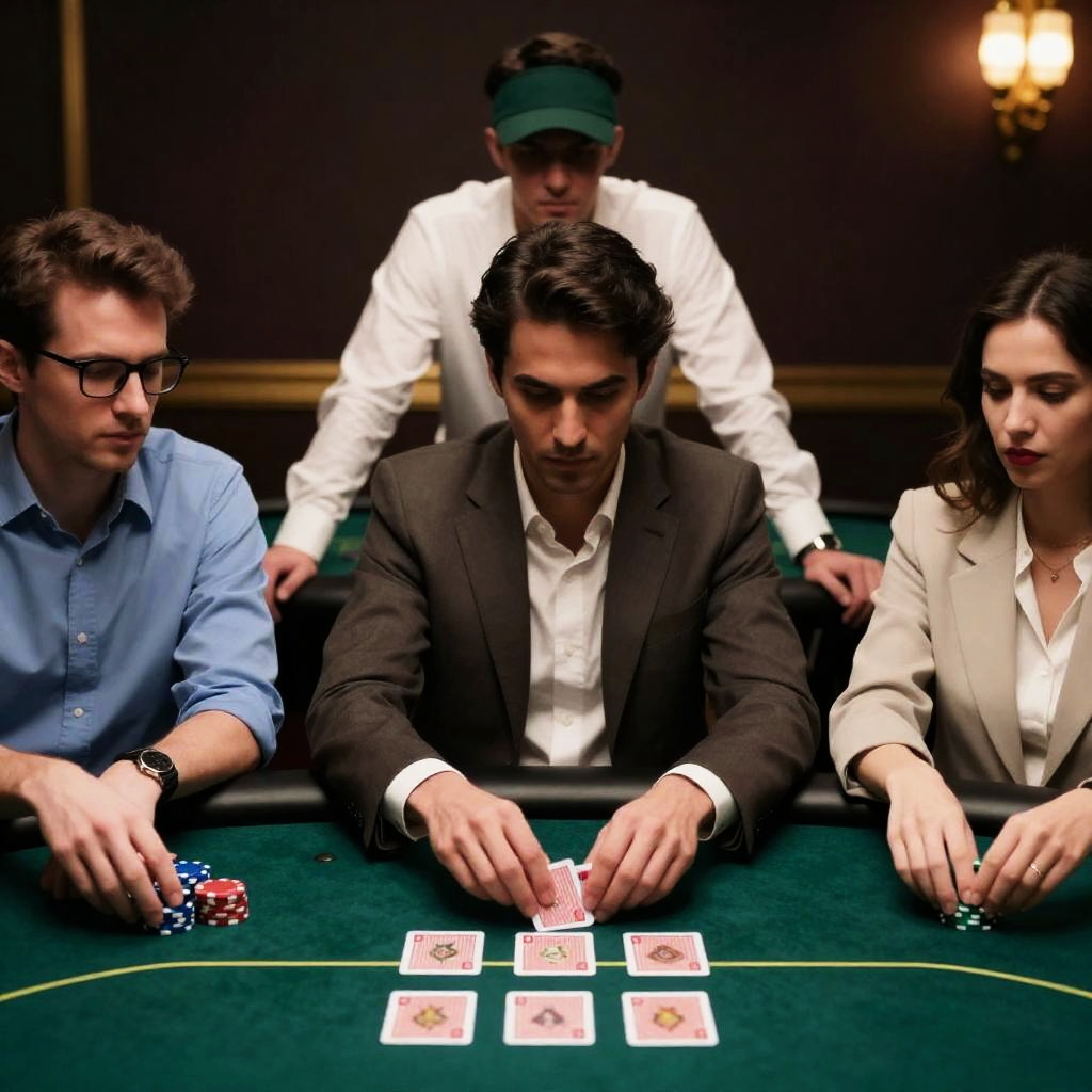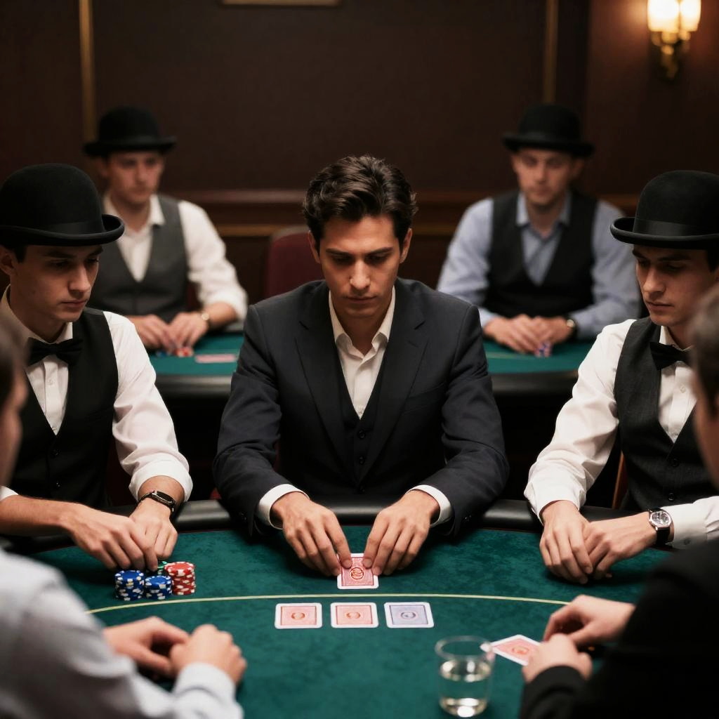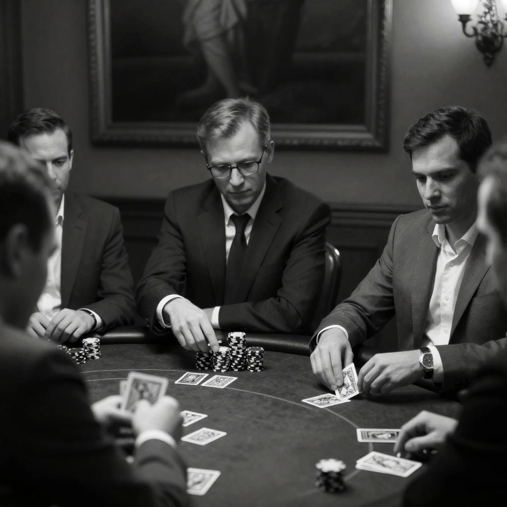 Photograph of a crowded casino poker room. 20 people, mostly men in suits and ties, and one woman in a pink blouse. Green poker tables, ornate chandeliers. Poker players and onlookers stand and sit around tables. Intense expressions on some faces. Background includes more seated people and a piano. Rich, dark carpeting.