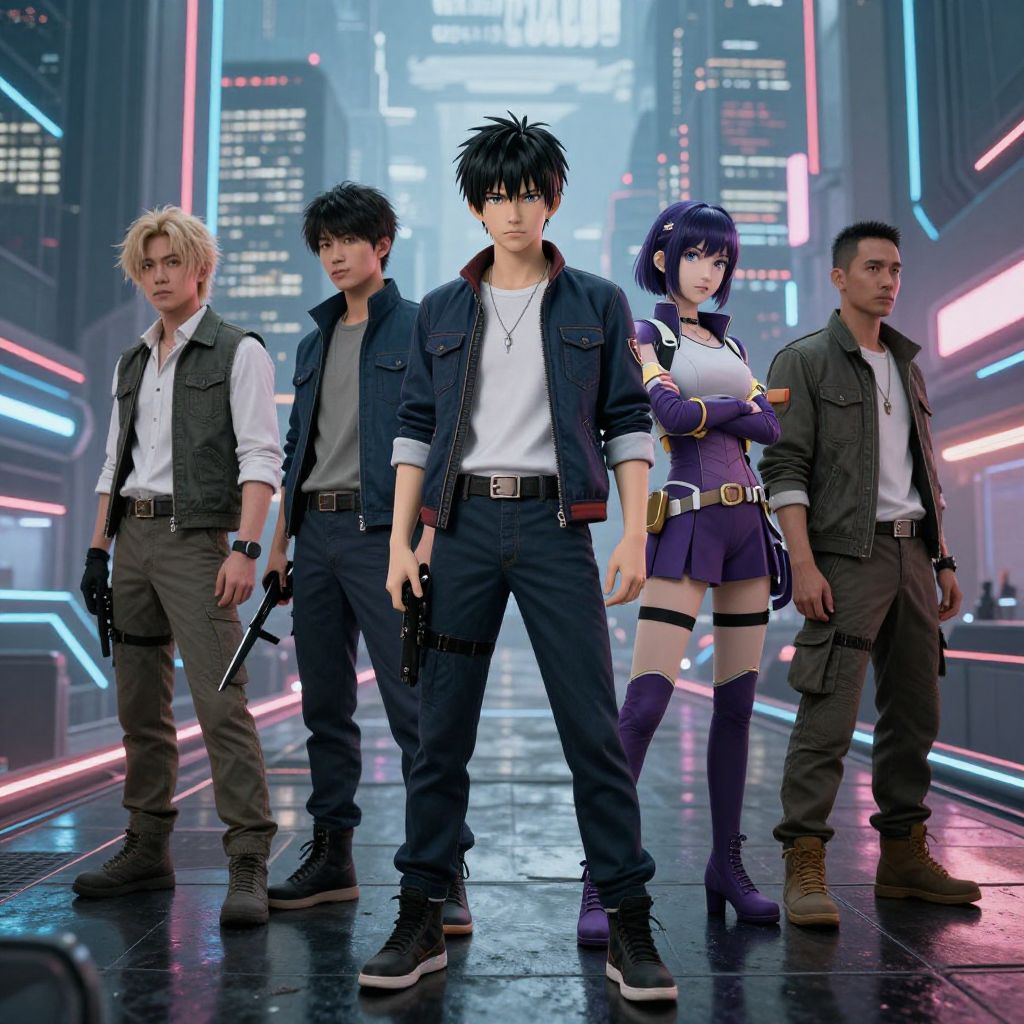 This is a digital CGI image in a futuristic, cyberpunk style. It features five anime-style characters standing in a neon-lit, urban alleyway with towering skyscrapers in the background. The central character, a black-haired boy in a white t-shirt and black jacket, stands confidently with hands on his hips. To his left, a blonde boy in a white shirt and grey vest holds a gun. On the right, a purple-haired girl in a form-fitting, purple and white outfit with thigh-high boots stands with arms crossed. Another black-haired boy in a similar outfit stands behind her, and a dark-haired man in a grey jacket and white shirt stands on the far right. Bright neon lights in pink, blue, and white illuminate the scene.