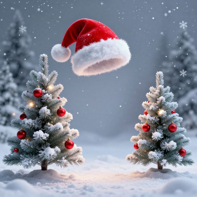 Photograph of two snow-covered Christmas trees with red ornaments, glowing lights, and a red Santa hat mid-air against a snowy, starry backdrop.