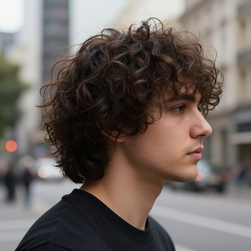 Realistic photography of a wavy blowout on a fit european man, natural lighting, urban street style, casual outfit, high quality, detailed hair texture, professional styling, modern aesthetic, 4k resolution