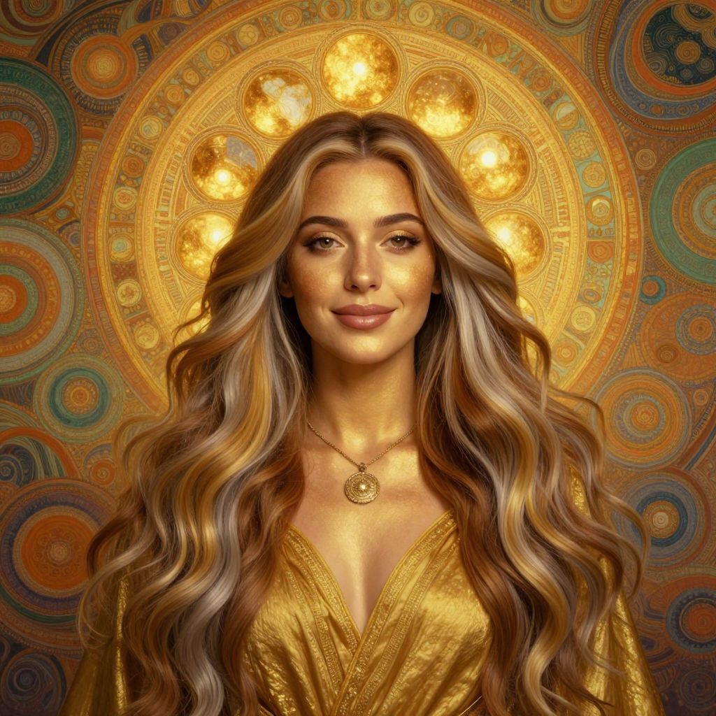 The image presents a striking portrait of a woman, exuding a serene and positive aura. Her long, flowing hair, a blend of blonde, brown, and silver strands, cascades elegantly around her shoulders. The woman's face is adorned with a halo-like arrangement of golden orbs, each encircled by intricate patterns, adding a celestial quality to her appearance. Her skin glows with a warm, golden hue, complementing the rich palette of yellows, oranges, and greens that dominate the background. She wears a delicate necklace with a circular pendant, and her attire is a flowing, golden garment that complements her overall appearance. The interplay of colors, textures, and shapes creates a harmonious and visually captivating composition, with the woman positioned centrally, surrounded by a complex array of patterns and orbs that draw the viewer's eye across the image.