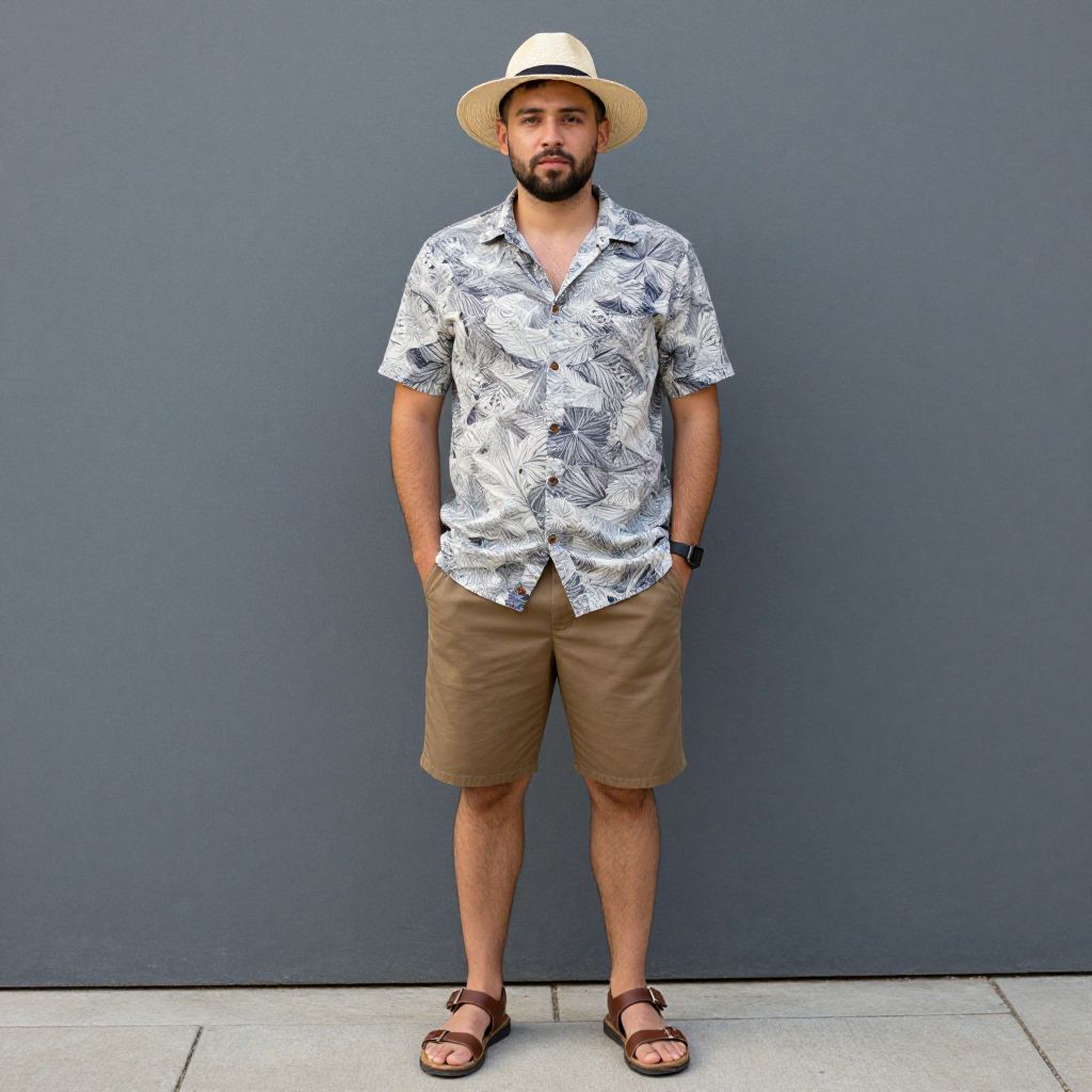 Photograph of a bearded man standing against a solid gray wall. He wears a white, short-sleeve, Hawaiian-style shirt with black floral patterns, beige knee-length shorts, brown sandals, and a wide-brimmed beige straw hat. His hands are in his pockets, and he has a serious expression. The background is plain and unadorned, emphasizing his casual, summer outfit. The ground is light gray concrete, and the lighting is even, casting no shadows. The overall style is simple and relaxed.