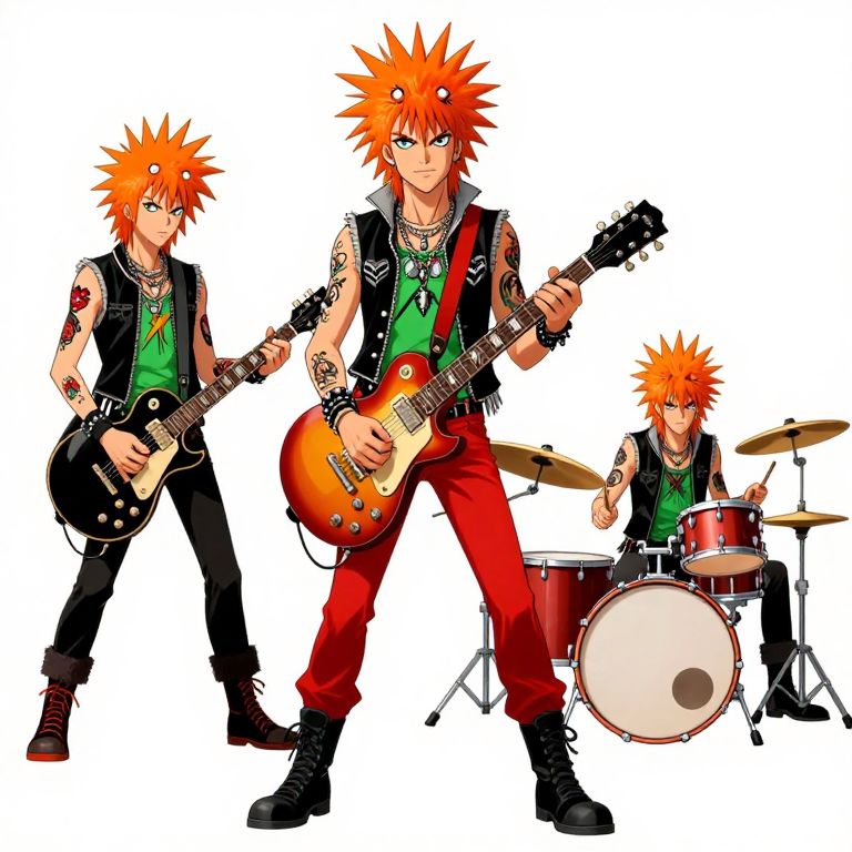 This digital anime-style illustration features three spiky orange-haired male musicians with pale skin and green shirts under black sleeveless vests and red pants. The central figure, with a serious expression, holds an orange electric guitar. To the left, another spiky-haired character plays a black electric guitar, and to the right, a drummer with a similar hairstyle plays a red drum set. All three wear black boots, necklaces, and bracelets, and have tattoos on their arms. The white background emphasizes the vibrant colors and dynamic poses of the musicians. The illustration has a bold, colorful, and energetic style.
