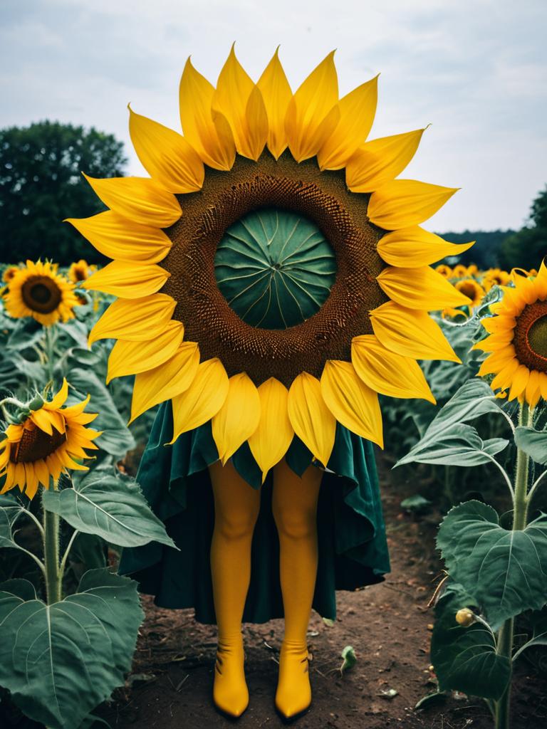 Person in Sunflower Costume, full-body cosplay photo with oversized petals