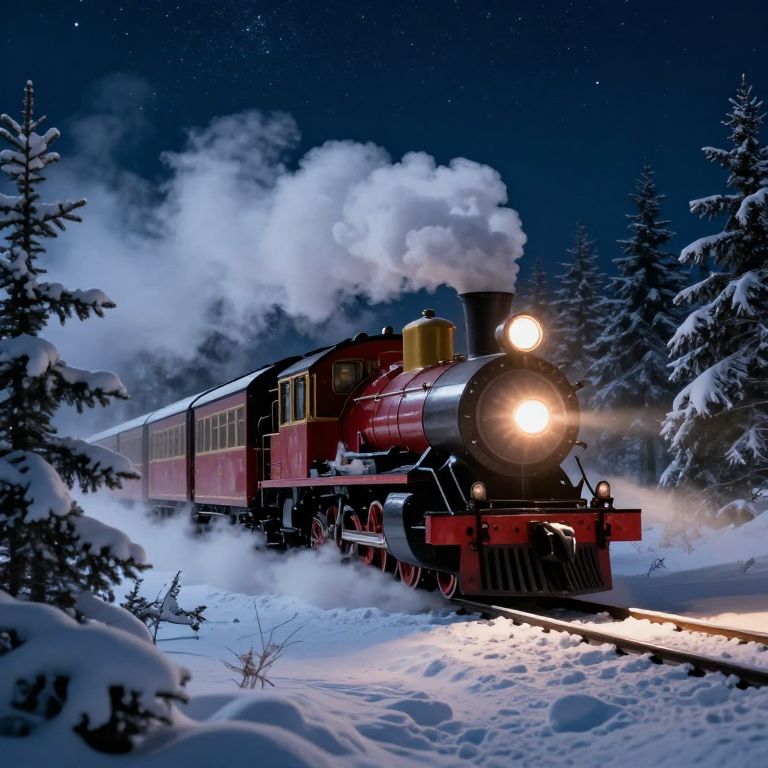 Polar Express train chugs through a snowy winter landscape, emitting billowing steam as it illuminates the night with its warm headlights, surrounded by snow-covered evergreen trees under a starry sky.