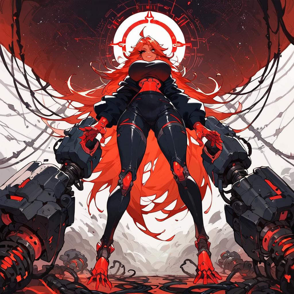 Digital art of a full-body female robot character with long flowing red hair and mechanical toes, standing in a powerful pose with an arched back. She wears a tight black and red futuristic outfit featuring advanced robotic joints and armor-like elements. The background is cosmic with swirling cables and wires, emphasizing a high-tech, sci-fi atmosphere. The character's confident smirk and glowing mechanical details highlight her intervention unit role in a dystopian setting.