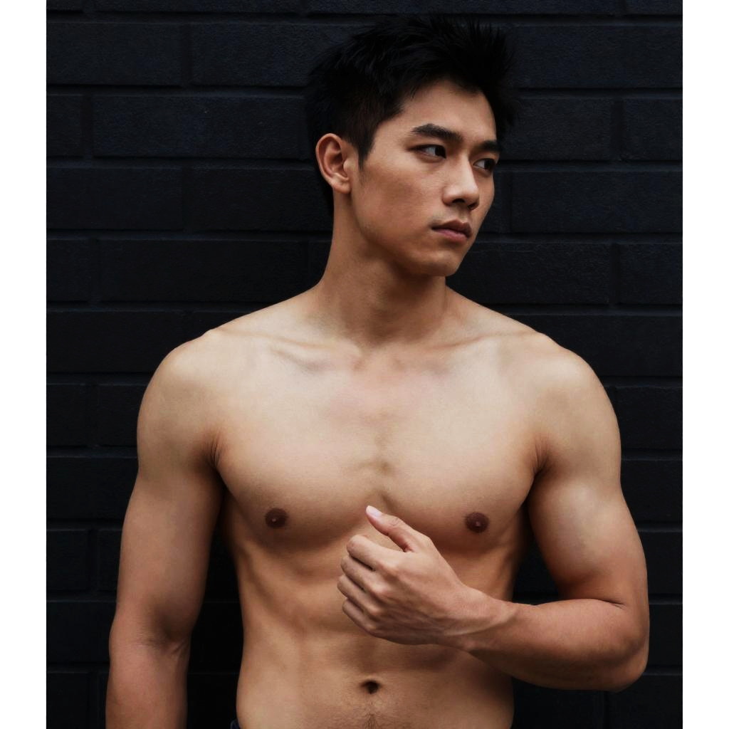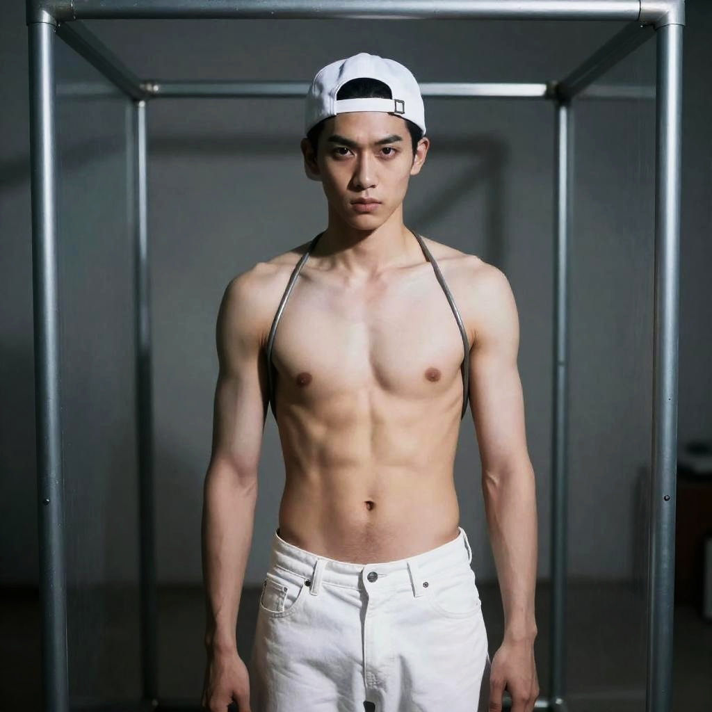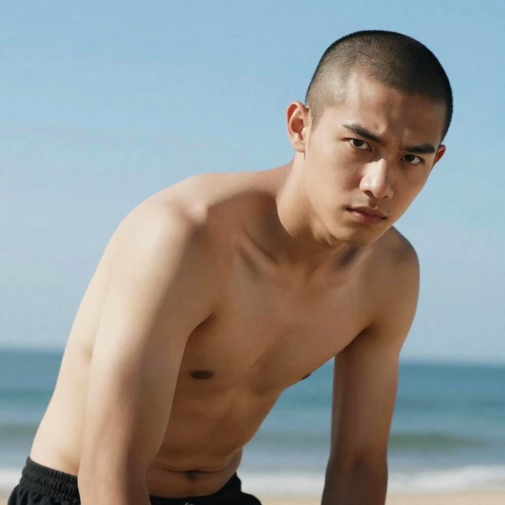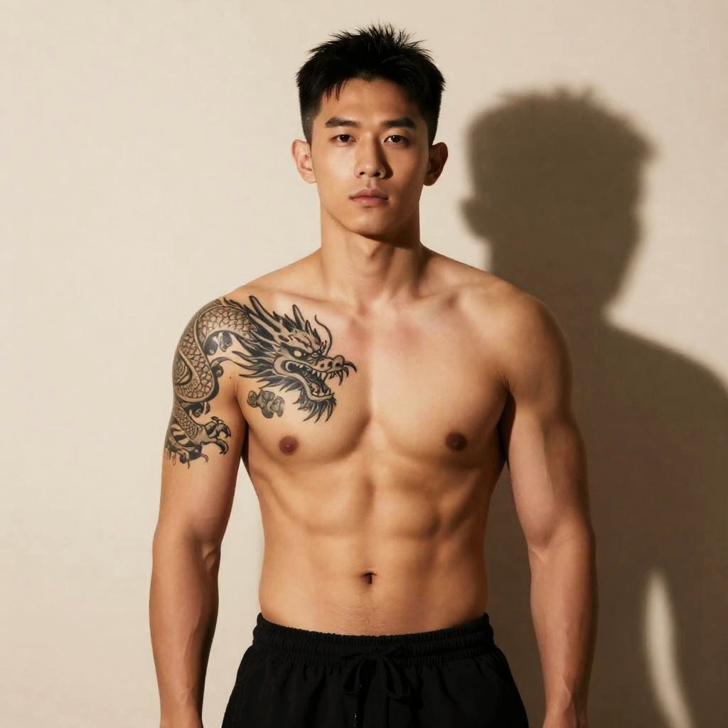 Shirtless man with muscular build, light skin, and defined abs stands against a vibrant blue sky. He wears green pants, hands resting on waist. Shadow of his head and upper body falls to the right. Bright sunlight highlights his chest and arms.
