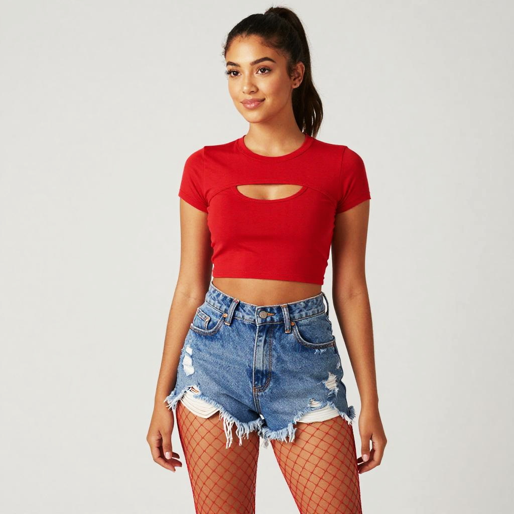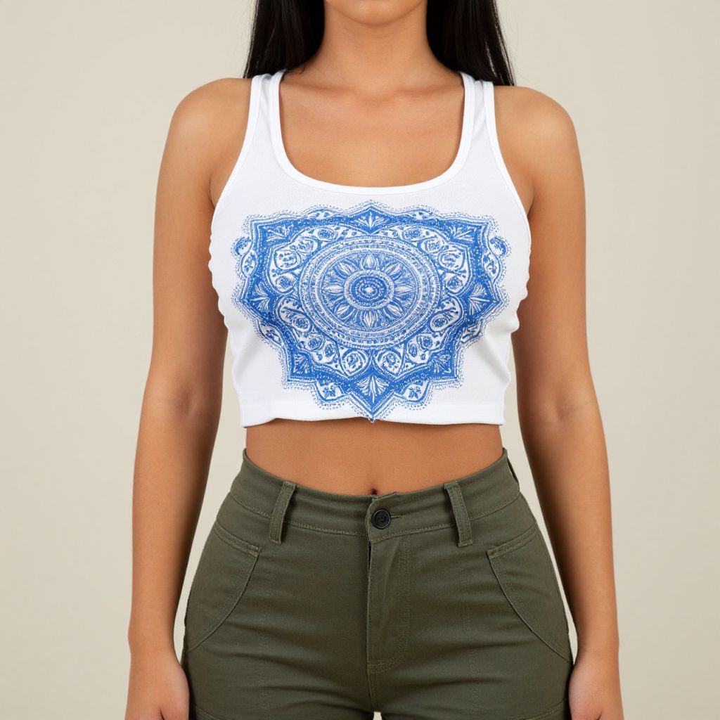 Photograph of a woman from the neck down, wearing a white sleeveless crop top with a blue mandala pattern on the chest. Her top reveals her midriff and she has olive skin. She is also wearing high-waisted, dark green pants with a button and zipper. Her straight, black hair falls just past her shoulders. The background is a plain, off-white wall, providing a neutral contrast to her outfit. The image is brightly lit, emphasizing the colors and patterns on her top.