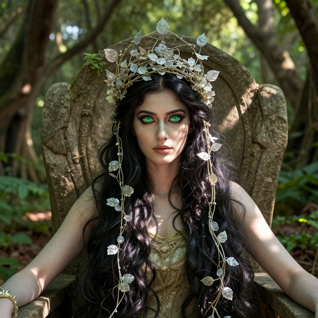 Craft a captivating portrait of a mysterious South Asian woman with porcelain skin and vibrant green eyes, seated upon an ancient stone throne in an enchanted forest clearing. Adorned with an intricate crown of silver vines intertwined with translucent leaves and delicate flowers, her long hair merges seamlessly with the lush foliage. Glimmering rays of sunlight filter through the canopy above, casting dappled shadows across her face and illuminating her ethereal aura. This portrait should exude both beauty and intrigue, drawing viewers into her captivating gaze as she shares an unspoken secret.