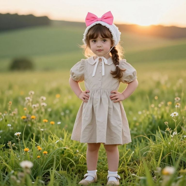 A cheerful young girl with long, flowing brown hair that falls past her shoulders, wearing a soft pink dress with a large, vibrant pink bow on her head, adding a playful and sweet touch. She is standing in a sunny meadow with flowers blooming around her, and she is wearing a pair of matching pink shoes that add to the lively, childlike charm of the scene. The lighting is warm and golden, highlighting her joyful expression and the details of her outfit, creating a whimsical and nostalgic atmosphere.