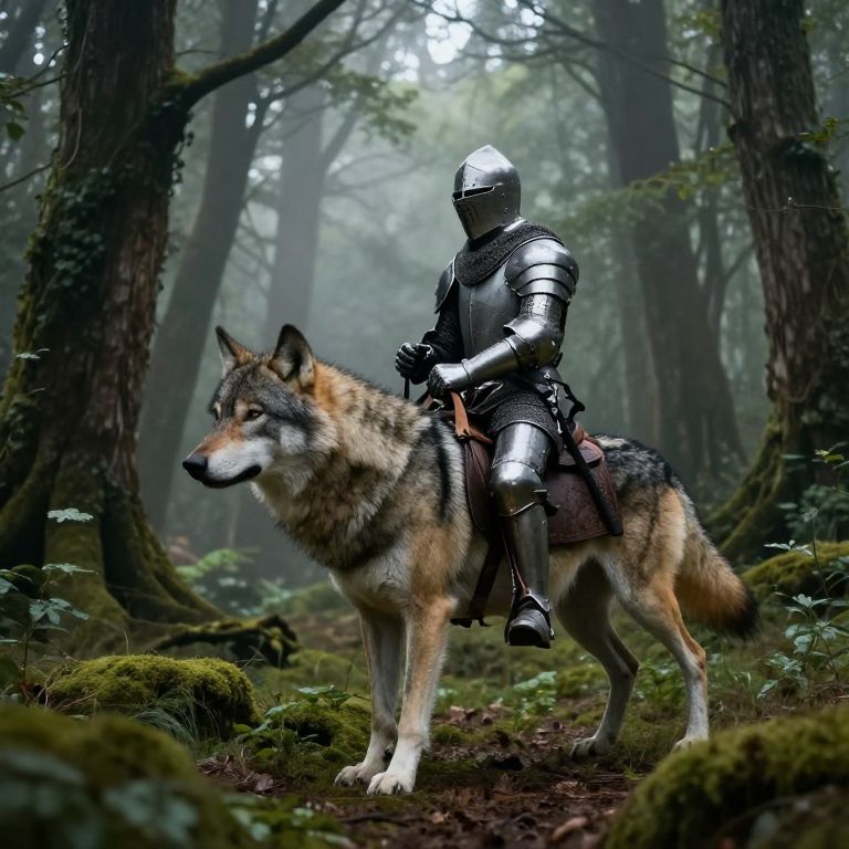 In a realm where nature and chivalry intertwine, a lone knight clad in armor rides a timber wolf through the misty embrace of an enchanted forest, embodying the delicate dance between freedom and duty, as the earthy scent of moss and the whispering leaves echo the timeless struggle for harmony.
