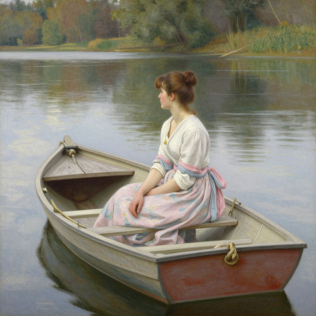 This digital painting depicts a fair-skinned woman with brown hair in a bun, sitting in a small, wooden rowboat on a calm lake. She wears a white, slightly rumpled blouse with a blue ribbon at the neckline and a pink, full-skirted dress. She holds a rowing oar across her lap. The background features a serene, reflective lake surrounded by trees with autumnal colors, including greens, yellows, and browns. The water's surface is smooth, reflecting the muted, overcast sky. The boat is positioned slightly to the right, with the woman facing left, lost in thought. The painting has a realistic yet slightly impressionistic style, emphasizing soft textures and gentle light.