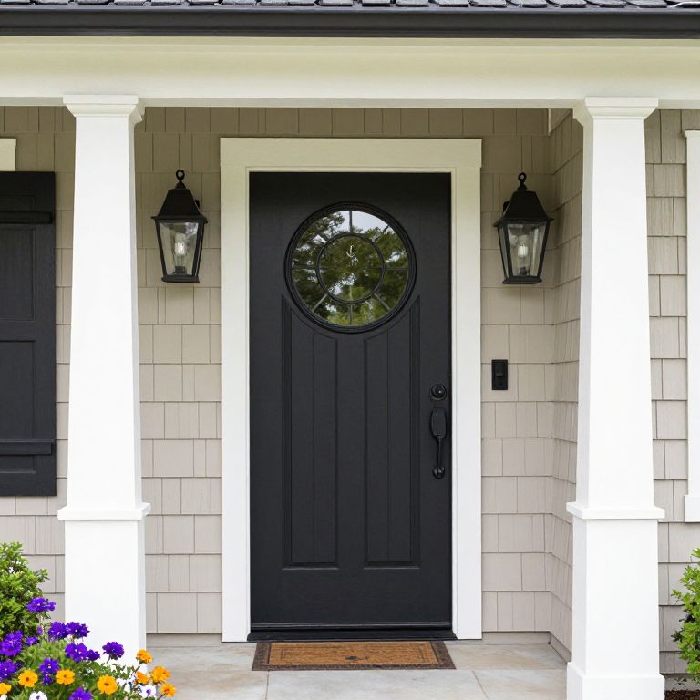 Craftsman-style entryway featuring Therma Tru doors with a round window, flanked by two black lantern-style light fixtures, supported by white columns, and accented by vibrant purple and orange flowers in the foreground, set against a backdrop of light beige shingle siding and dark trim.