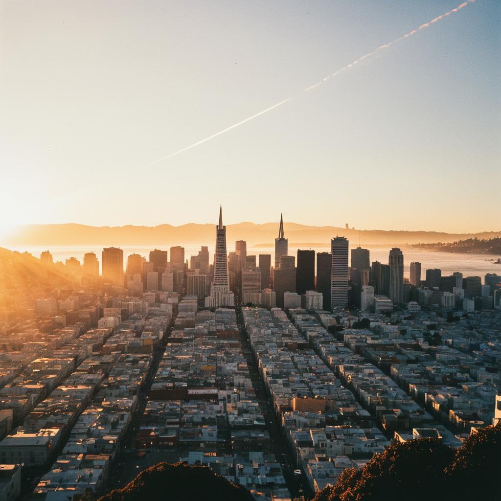 Skyline of Chicago at sunset, oil painting, volumetric lighting, god rays