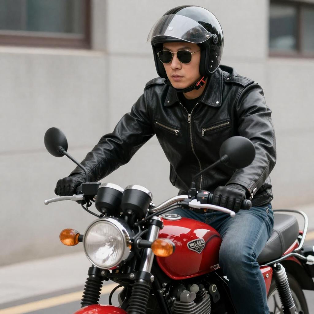 A man in a black leather jacket, helmet, and sunglasses rides a red motorcycle. He has a focused expression. Background includes a concrete wall and a window. He wears black gloves. Motorcycle has a silver headlight and red "AT" .