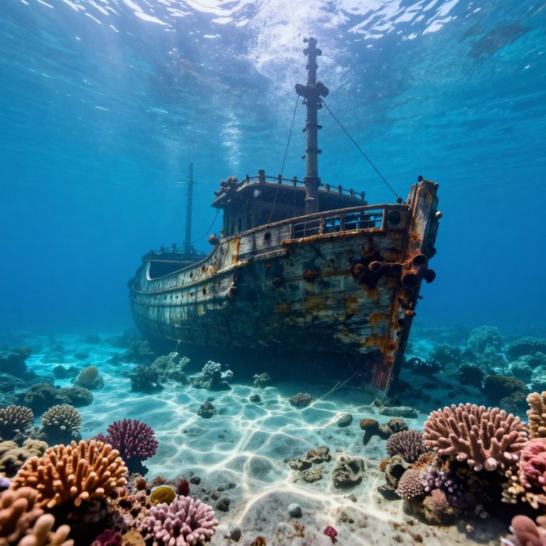 Photograph of a sunken, rusted pirate ship surrounded by vibrant coral reefs and clear blue ocean water, sunlight filtering through the water surface.