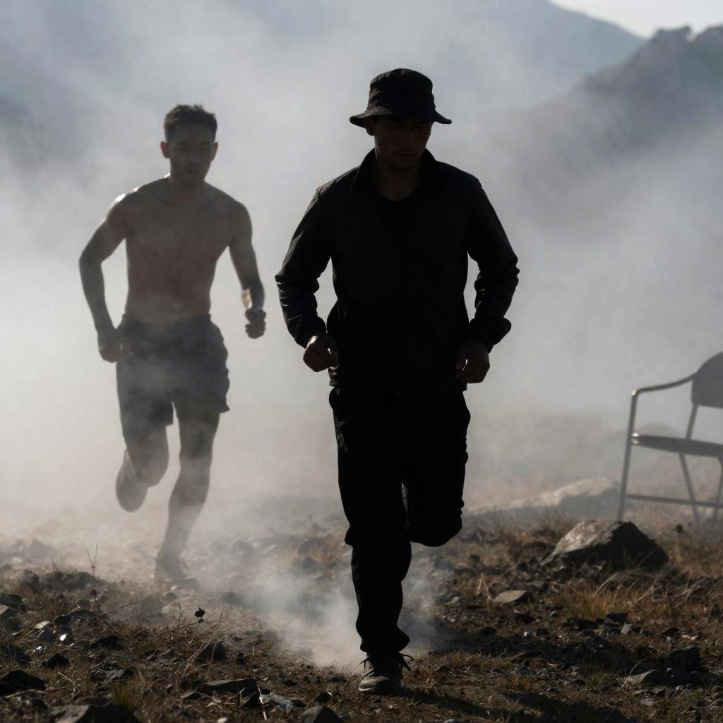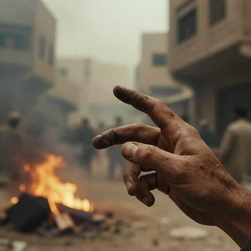 Close up of a dirty hand touching the tips of the fingers in a reflection in the style of The Creation of Adam, fog, war scenario, fire at background, chaotic atmosphere, chaotic, dust and particles in the air, cinematic shot, soft contrast, texture, highly detailed scene, dramatic atmosphere, Middle Eastern city street, 14mm, f1.4, vignette, dramatic photography, Creation of Adam style