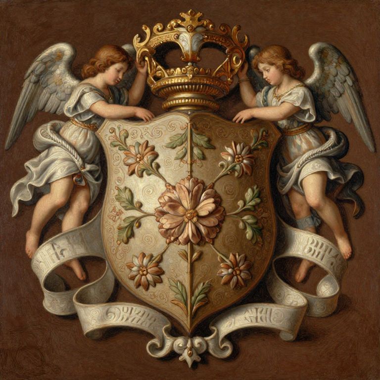 Creating a crest inspired by Renaissance art, featuring a shield with floral motifs, angels holding banners, warm earth tones and soft lighting, intricate brushstrokes and delicate patterns, symbolizing honor and tradition in a classic oil painting style.