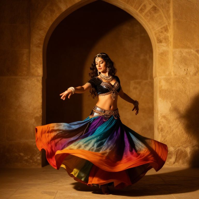 Photograph of a dark-haired woman in a colorful, flowing belly dance outfit, adorned with jewelry, dancing in a warm, arched stone alcove