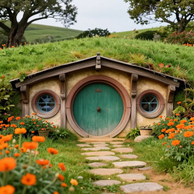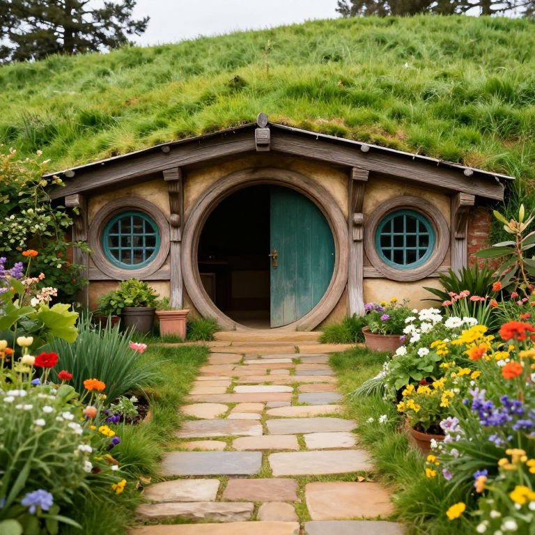 A whimsical hobbit home emerges from a lush, grassy hillside, its round windows and arched doorway invitingly nestled among vibrant gardens and a stone-paved path that defies conventional architectural norms.