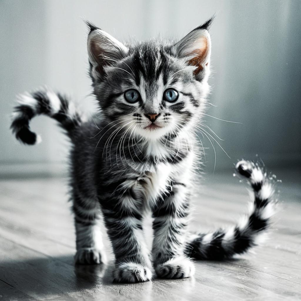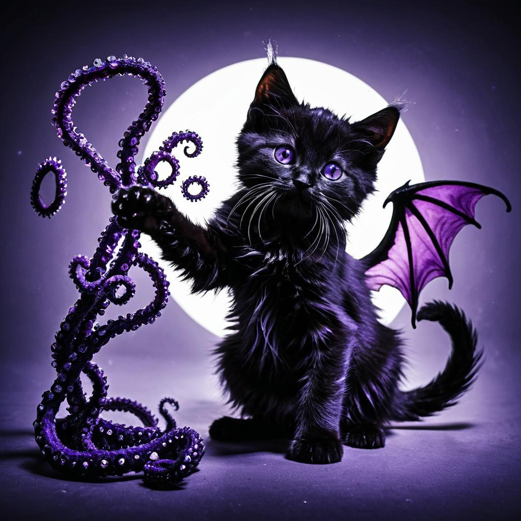 One cute kitten playing, midnight blue fluffy kitten, big bright glowing violet eyes, enigmatic, ghostly ethereal whiskers, hauntingly curious, aura of flickering shadow tentacles, seven slender spectral tails