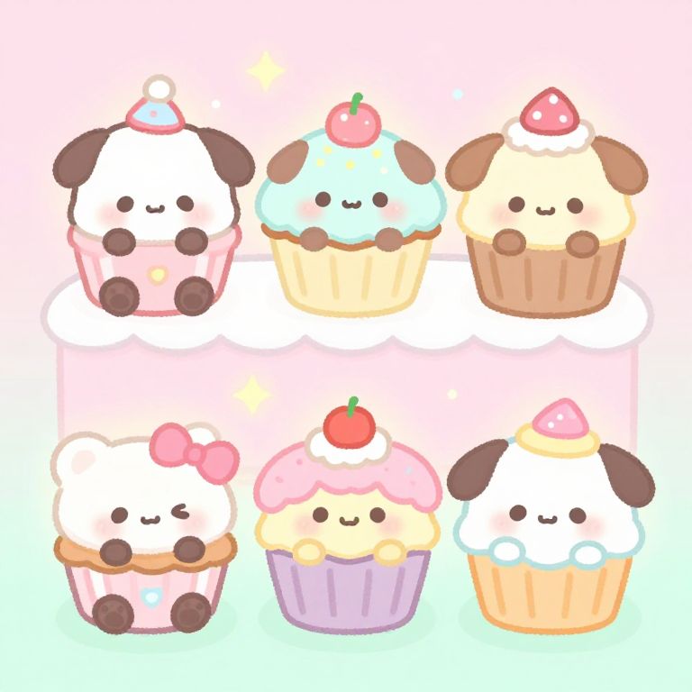 Digital drawing of six adorable, pastel-colored cupcakes with cute, chibi-style faces. Each cupcake has a different topping: one with a blue and pink swirl, a cherry on top, another with a strawberry, one with a pink bow, a cream-topped cupcake with a red cherry, and a cream-topped cupcake with a strawberry. All cupcakes have brown dog-like ears and paws, smiling black eyes, and are white with pink accents. The background is a soft gradient of pastel colors. The image has a kawaii (cute) aesthetic.